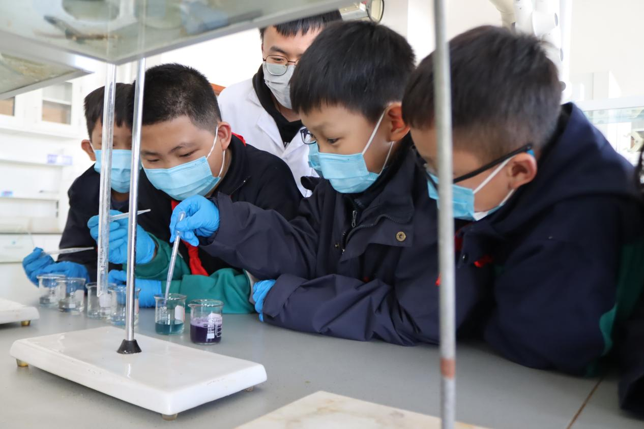 我院基础化学教学部实验室迎来beats365官方网站实验小学42名师生,开展沉浸式科普实践活动。现场展演"大象牙膏"(过氧化氢催化反应)、"紫甘蓝酸碱指示实验"等现象级化学实验。科普教育微专业第一批学员作为讲解员在协助实验老师演示实验的同时,还为小朋友们介绍了各种“高、精、尖”仪器设备,带领他们看到了实验室里身着白大褂的青年追梦者认真钻研、精益求精的样子,激发了孩子们对化学的学习兴趣、好奇心和探究欲望。