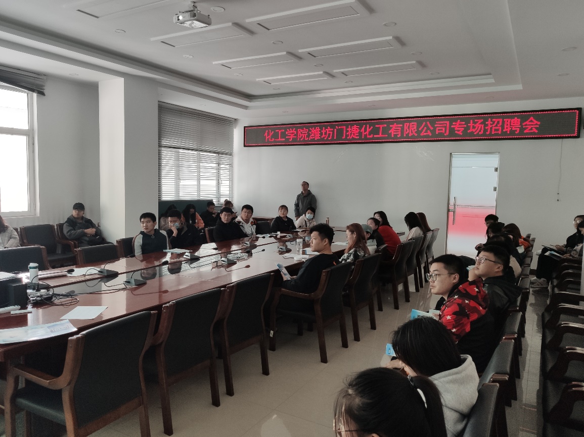 2020年10月27日10:00,在逸夫楼beats365E202会议室,召开潍坊门捷化工有限公司专场招聘。学院化学相关专业2021届毕业生30余人参加了此次招聘。