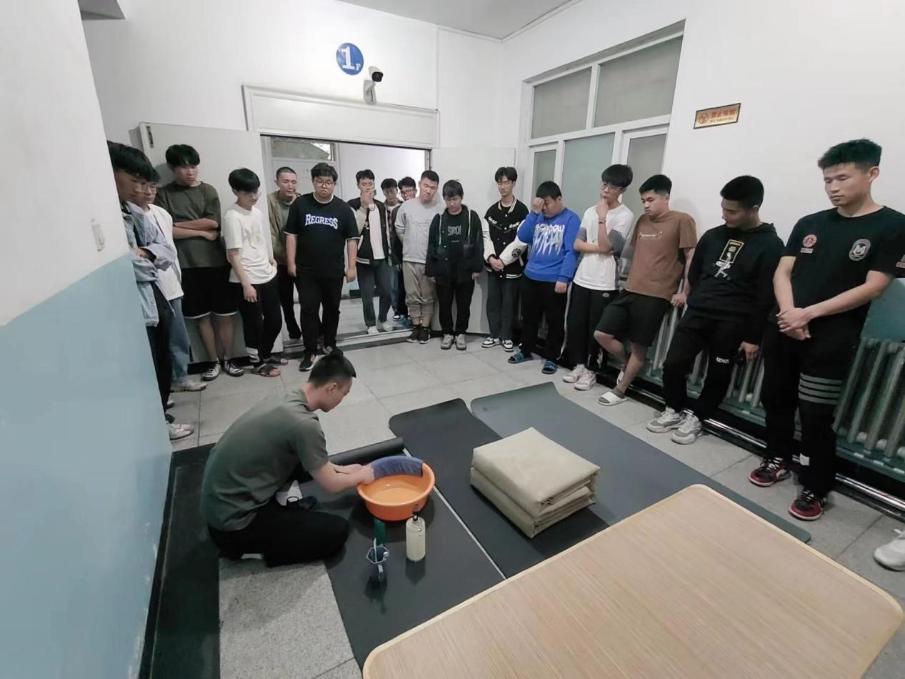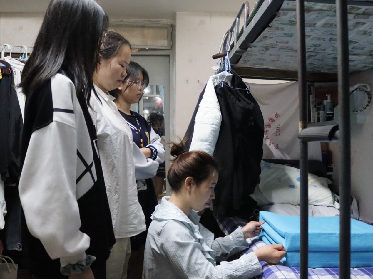 本次活动分别在26#男生宿舍楼和5#女生宿舍楼内进行,八名退伍老员工分批次为同学门示范了内务整理要点,在被子的折叠和摆放位置、床铺整理、生活用品的规范摆放、室内整体清洁标准等方面进行详细讲解。他们边操作边讲解,熟练而精准地借助 “压、折、挤、掏”等基本动作完成了从棉被到“豆腐块”的华丽转变,赢得了同学们的称赞。学习过程中,同学认真聆听,并按照要求在宿舍进行了整理,内务整理工作初见成效。