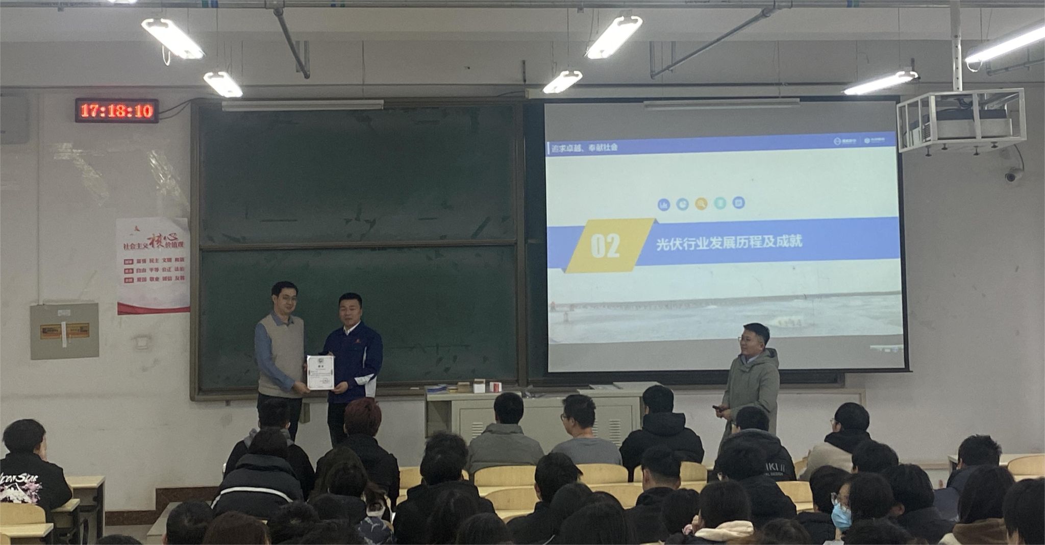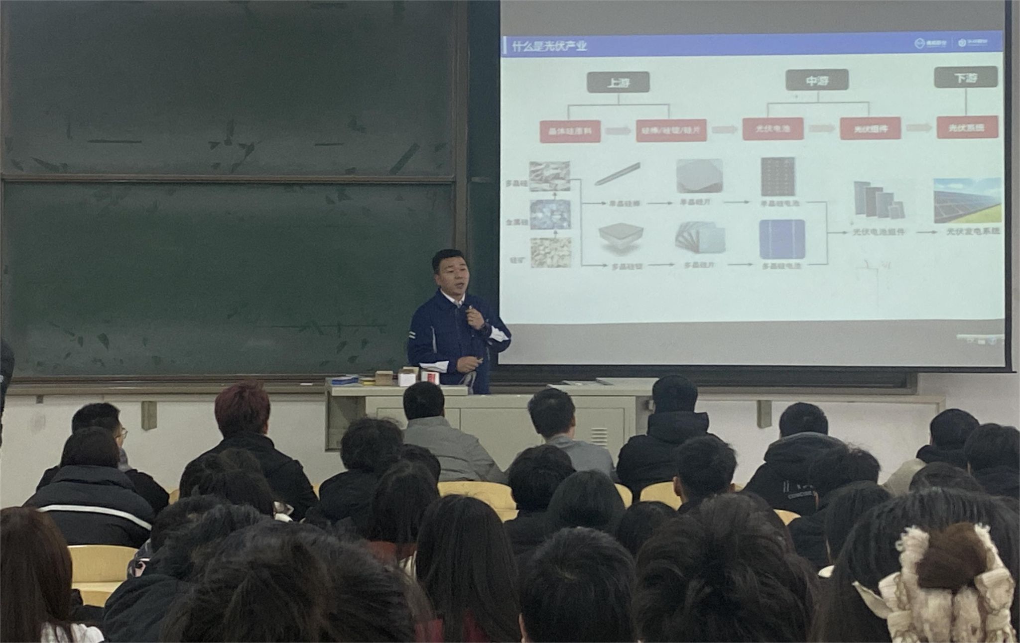 3月5日,硅业学院校企共建课程《新能源技术前瞻》专业课正式开课。本次课程特邀内蒙古通威高纯晶硅有限公司品管部慕道焱部长,讲授光伏行业的发展历程和未来展望。系主任成建国首先对慕部长表示热烈欢迎,介绍了他在光伏产业的卓越贡献和专业素养。课上,慕部长对光伏行业的发展历程和前沿动态倾囊相授,深入剖析了晶硅材料在新能源领域的关键作用,展示了晶硅光伏产业的无限可能性。员工们纷纷表示,本次课程让自己对光伏产业有了更深刻的认识,激发了他们对相关专业知识学习的兴趣,并且进一步明确了要好好学习、服务产业的目标。