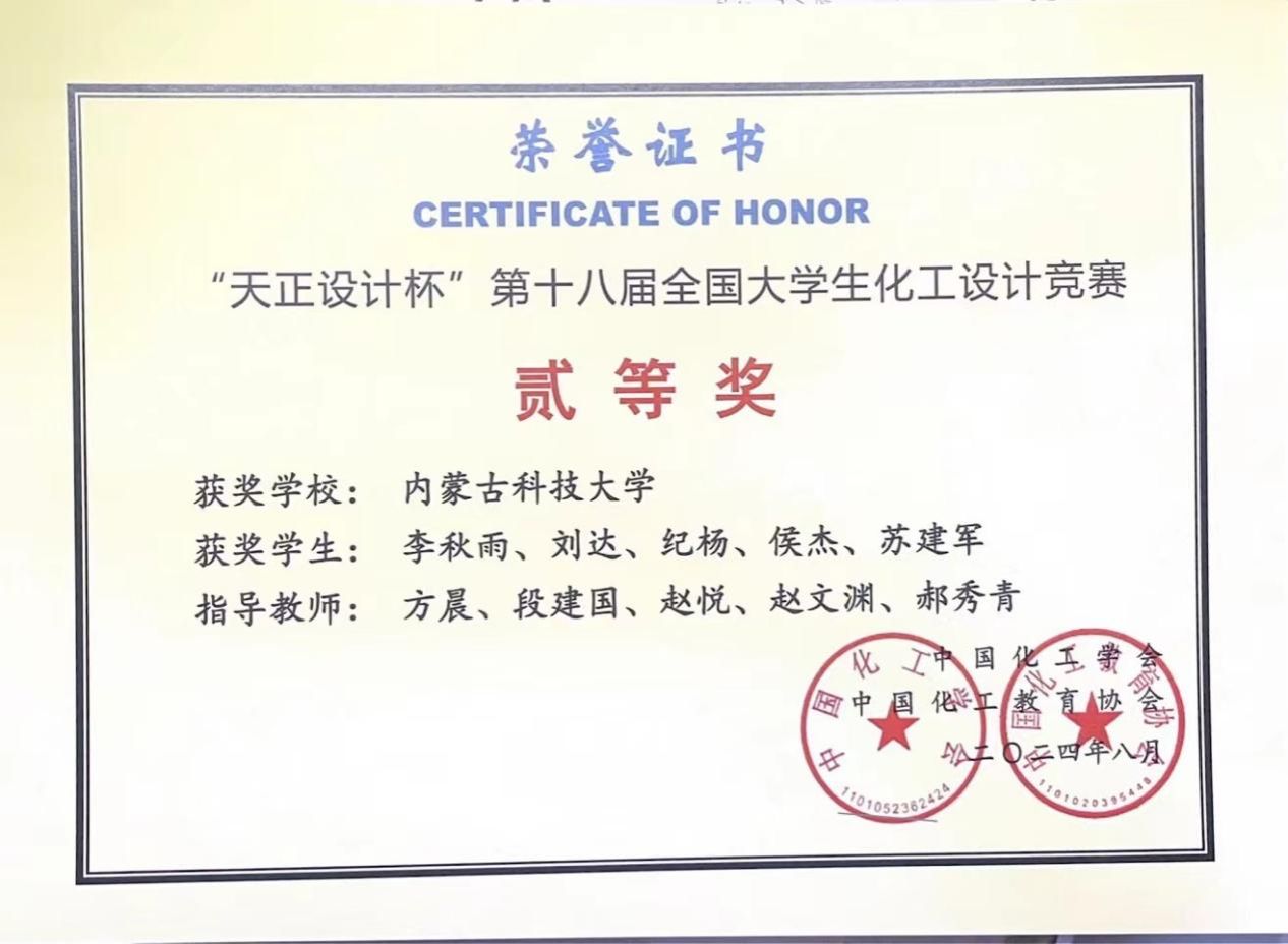公司员工李秋雨、刘达、纪杨、侯杰、苏建军组成的“活力醛开,醇享未来”团队,在方晨、段建国、赵悦、赵文渊、郝秀青老师的指导下,凭借扎实和良好的工程教育素养荣获全国老员工化工设计竞赛全国二等奖、华北赛区一等奖。