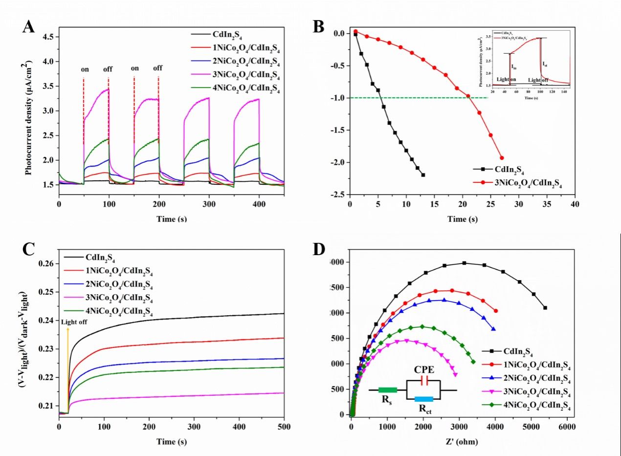 研究表明,NiCo2O4/CdIn2S4异质结光催化剂的产氢活性明显提高,产氢活性高达624 μmol⋅g-1⋅h-1,约是CdIn2S4-1%Pt活性的3.2倍。通过一系列表征表明,异质结光催化剂的产氢活性得到有效改善的原因主要有两方面:(1)随着高比表面积NiCo2O4的引入,复合材料的比表面积极大地提高,NiCo2O4的氧化还原中心,二者使复合材料在析氢活性位点方面得到极大地改善。(2)光致发光结果、X射线光电子能谱和众多电化学结果表明,S型异质结的形成和氧化还原中心的存在极大地提高了载流子的分离和迁移,为产氢反应提供更多的电子。