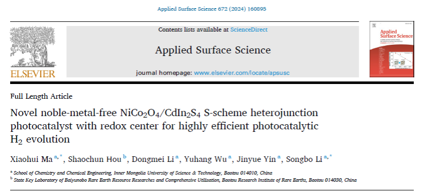 近日,我院马晓辉博士在国际TOP期刊Applied Surface Science上发表题为“Novel noble-metal-free NiCo2O4/CdIn2S4S-scheme heterojunction photocatalyst with redox center for highly efficient photocatalytic H2evolution”(Appl. Surf. Sci. 672 (2024) 160895)的重要研究成果。马晓辉博士为该论文第一作者兼通讯作者,李松波教授为共同通讯作者,beats365为本论文的第一完成单位。