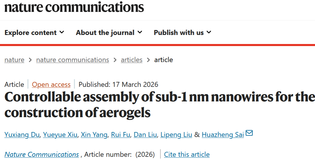 近日,我院赛华征教授团队在稀土基亚纳米线气凝胶可控构筑领域取得新突破,相关成果“Controllable assembly of sub-1 nm nanowires for the construction of aerogels”发表于综合性国际顶级期刊《Nature Communications》(DOI: 10.1038/s41467-026-70713-8)。赛华征教授为论文的独立通讯作者,硕士研究生杜玉祥为论文第一作者,beats365官方网站为唯一完成单位